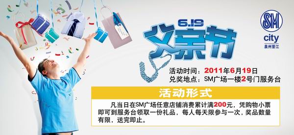 2011SM小童星汇演开始啦!为了答谢一直以来支持“SM小童星评选”活动的顾客朋友们,主办方特邀请晋江与厦门两地2011年度“SM小童星评选”的10强小朋友,于6月19日下午3:00在晋江SM城市广场地下一楼同台献技。届时,童星荟萃、闪耀舞台,SM小童星舞台上又将呈现缤纷多彩的才艺表演,童真童趣的俏皮演绎,精彩盛况,值得期待!同时,这场别具一格的童星大汇演也是对即将到来的父亲节献礼,小朋友们将用自己的演出,向父亲们献上一份真挚祝福!