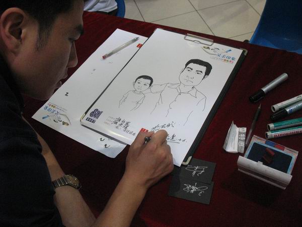 在活动现场,漫画艺人抓住父子/女的神韵和相似之处,采用夸张的漫画手法进行表现,其间,父亲和孩子还可轻松交谈。而在短短10分钟的漫画过程中,不仅拉近了父亲与孩子间的距离,更让人感受到了父亲和孩子间浓浓的亲情。同时,我们还邀请了专门的签名设计艺人巧妙地将父子女两个独立分开的名字进行艺术结合,并在漫画上唯妙体现了出来。一位姓王的父亲告诉我们,昨天刚好是他小公主的生日,他也希望把这份特殊的礼物献给女儿,祝福女儿生日快乐,也让自己过个更具纪念意义的父亲节。