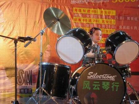 上图为:68号小选手林钖的架子鼓表演动感十足