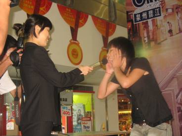 当晚七点半,主办方进行的嗓门王争霸赛也同样吸引了许多观众驻足观看。10大嗓门高手齐聚于地下一楼舞台,一决雌雄,PK出最后的嗓门王!整场比赛喊声彻天,悬念迭出,最后,来自晋江灵源的柯文切以126.9的最高分贝夺得冠军,成为当晚的嗓门王。而曾雅瑜以126.4的高分贝屈居亚军,洪珊珊也以骄傲的分贝赢得了季军的头衔。比赛结束后,主办方进行了“中国金牌猜,北京5日游”电脑抽奖活动,10位幸运顾客获奖。