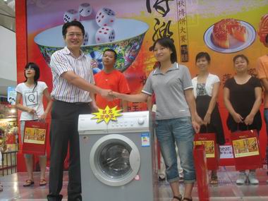 现场准备着代表好运连连的六个“超级”骰子,由每位状元依次上台掷色子,在规定范围内产生的级别进行比大小,如果是相同的级别,则根据实际点数进行比大小。第一位状元吴昌红女士可能由于过于紧张,把骰子丢出了规定范围之外,遗憾的失去了竞争“状元王中王”的机会。接下来的选手或滚骰子,或跑骰子,或投骰子,各种绝招齐上阵,希望博出一个好彩头。最后第七位状元黄元敏女士和第十位状元王振东先生都掷出了二举,而根据活动规则,同是二举所带的点数相加多者胜,因此黄元敏小姐最后如愿成为了2008SM中秋博饼大赛“状元王中王”,赢得了价值2299元的洗衣机一台。