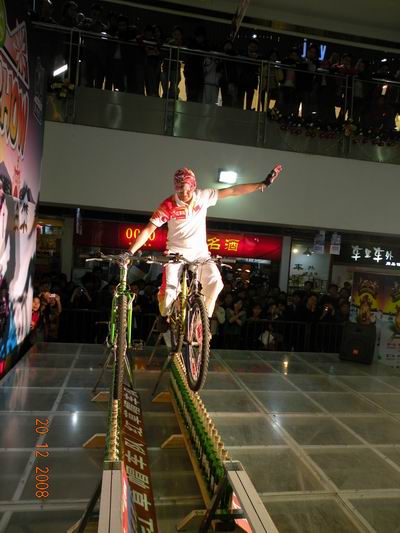 自行车王子王建光表演绝活“单骑过酒瓶”