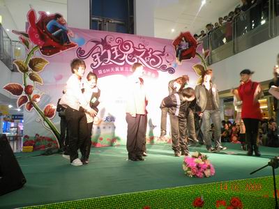 当天,两对情侣上台讲述自己的浪漫爱情故事,还有6名入场相亲的单身男女获得价值千元白K金对戒和天翼情侣手机号码。此外,神秘的爱神天使丘比特也来到SM广场,免费派发1000份精致的巧克力花给逛商场的情侣们。
