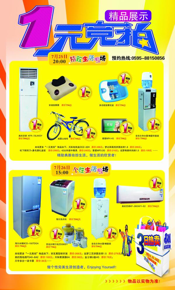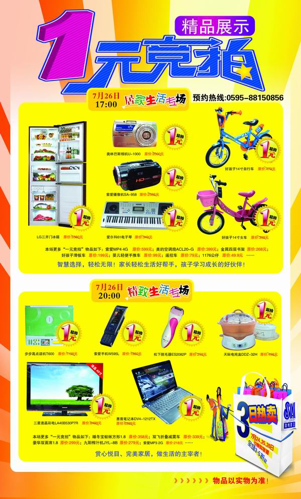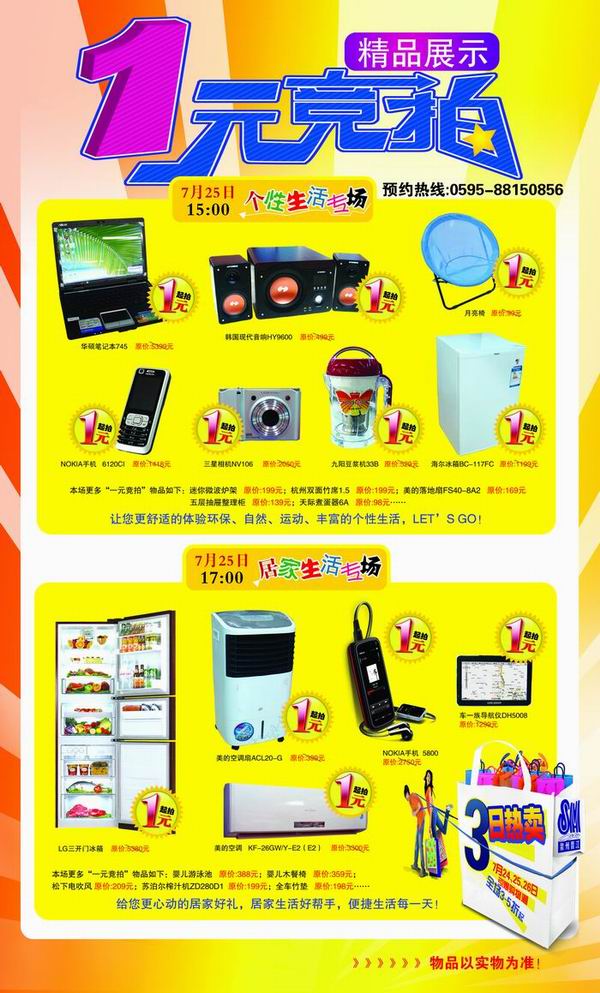 凭当日购物小票、SM三日热卖短信或DM宣传册,即可入场参加1元竞拍。