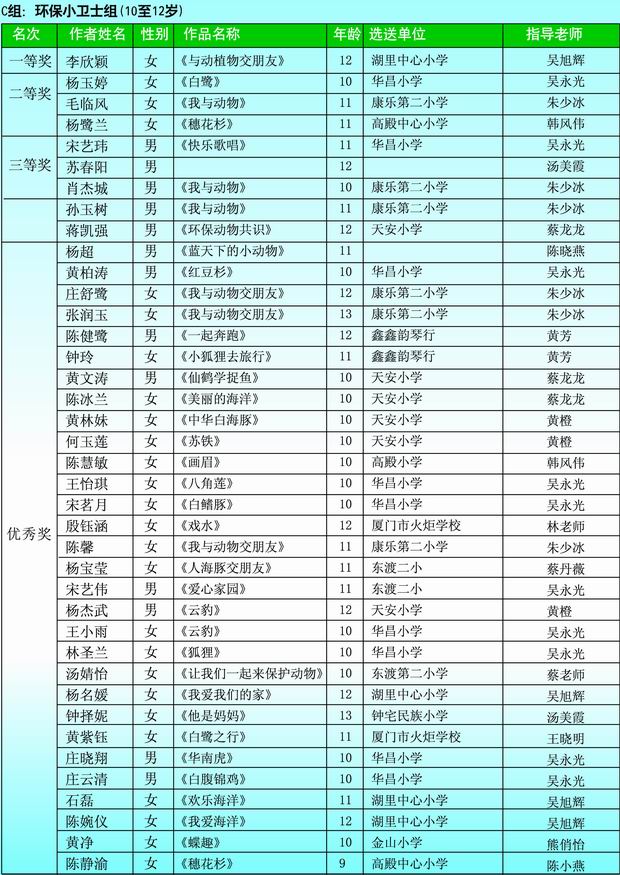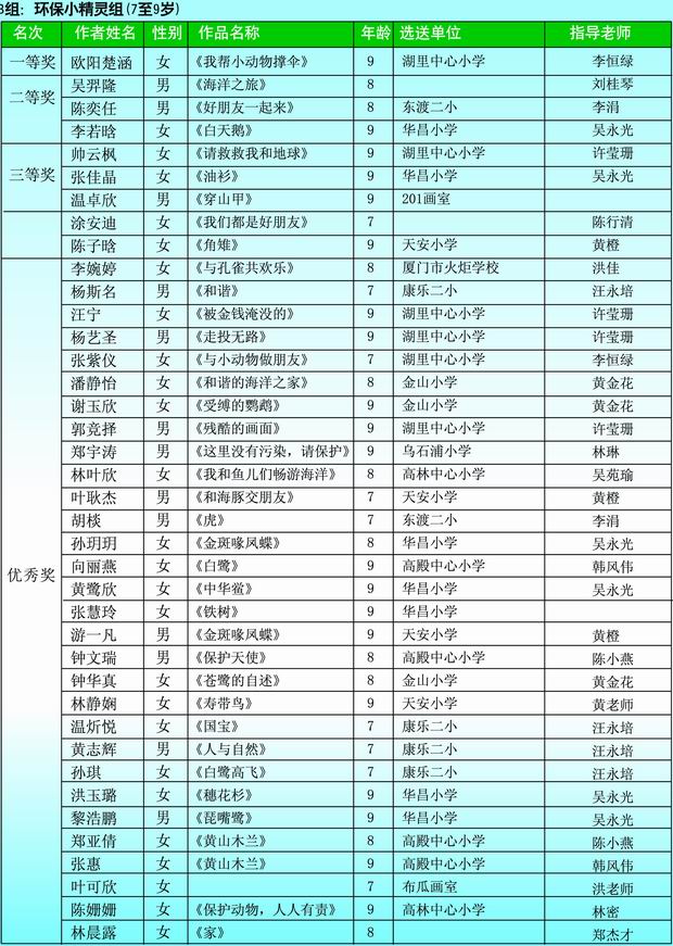 由共青团湖里区委员会、湖里区教育局、厦门市野生动物保护协会以及SM城市广场的共同主办的“与动植物交朋友——SM关注珍稀野生动植物环保绘画大赛”现已圆满结束。此次活动得到了广大市民的重视和支持,活动的影响范围也由岛内扩展到岛外各小学、幼儿园以及教育培训机构,报名总人数达到了2200人。通过比赛,小朋友们提高了环保意识。 在经过美术协会专家老师的几轮评选后,三个组别的各个奖项纷纷出炉,现将名单公布如下: