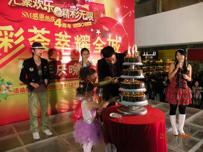 11月29日,SM精心准备了一场别开生面的四周年庆祝晚会,精彩绝伦的魔术和特技表演、活泼可爱的小童星献艺,在全体表演人员和顾客朋友们的簇拥下,在生日歌的祝福声中,SM四周年晚会圆满结束了。