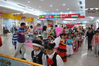 在此期间,最吸人眼球的莫过于由众多世博小明星共同参与的“异国服饰大巡游”了。来自不同幼儿园的小朋友们穿着各个国家民族服装在商场里快乐巡游,成了SM周末一道亮丽的风景,巡游队伍中不时响起的乐队伴奏将世博的氛围传递到商场的每个角落。