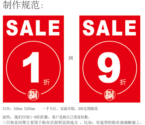 附件为三日热卖折扣牌模板,格式为Ai.,请各租户自行下载并严格按照说明执行制作!圆形折扣牌的尺寸是不可更改的,若租户因店内装饰需要制作成异形(如正方形或长方行)者可自行修改,但需保证颜色和字体严格按照标准执行不得更改。 咨询电话:5554146 请点击下载