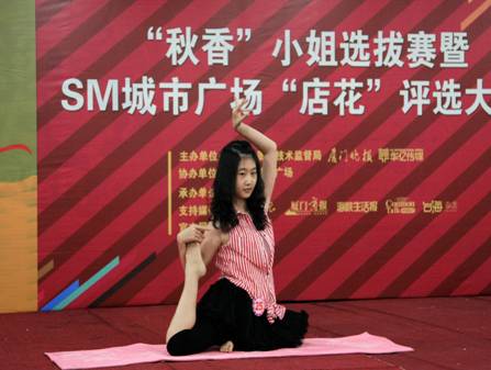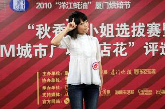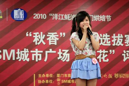 由厦门市质量监督局、《厦门晚报》,华亿传媒和SM城市广场举办的“秋香”小姐选拔赛 •暨2010厦门SM城市广场“店花”评选活动于9月17日落幕。参加此次活动的33名选手由各商家共同举荐。各位参赛选手需通过自我介绍、才艺表现,服务展示水平等方面来展现自己。评委则通过选手的语言表达、亲和程度、应变能力,风采展示和表演水平以及服务态度和思维逻辑等方面来进行综合评分。 最后,SM”秋香”小姐冠亚季军分别由30号方丹、25号叶玉玲、12号李晓燕摘得。“最佳才艺奖”得主是24号施恩惠。8号彭琴丽则凭借温柔的手语表演及优秀的服务考核荣获“最佳服务奖”。“最佳亲和奖”则由26号洪嘉娜获得。 冠军30号方丹倾情演绎歌曲。 亚军25号叶玉玲“舞”艺高超。 季军12号李晓燕的“秋香”回眸一笑。 24号施恩惠以肚皮舞表演摘取“最佳才艺奖”。 8号彭琴丽凭借温柔的手语表演及优秀的服务考核荣获“最佳服务奖”。 26号洪嘉娜以她甜美歌声和表现荣获“最佳亲和奖”。 9月22日,首届厦门“洋江蚝油”烘焙节即将在SM城市广场一楼中庭举办闭幕式,届时“秋香”们将集体带来精彩表演,欢迎大家前来赏“秋香”,和她们一起过个特别的中秋!