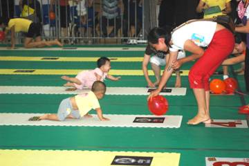 9月18日至10月10日的每个双休日10:00—12:00,成都成华SM城市广场在三楼多功能厅举行了成都最大规模的宝宝爬行比赛。全城850多名宝宝参加了此次大赛! 在本次比赛中,8名宝宝为一组,宝宝们需要在3分钟内爬完8米的赛道,比赛名次依爬完赛道的时间长短而定。此次比赛奖品丰富、贴心、实用。参赛的宝宝都获得了价值200元的超级大礼包作为参与奖,每场比赛的前十名优胜宝宝则获得了奶粉、纸尿裤、玩具、湿纸巾,摄影礼券等价值2000、1300、900、400元不等的奖品。参与这次赛事的家庭都非常积极。比赛还没开始,大约早上九点左右,就有许多家长已经在比赛场地外静静等候;比赛开始后,家长们则积极利用用各种道具,想尽各种方法引导宝宝往前爬行。比赛中,宝宝的一颦一笑、一举一动也都让家长们乐开了怀。 本季比赛已完美落幕。截止2010年10月10日,成华SM城市广场已成功举办四次成都最大规模的宝宝爬行比赛。此赛事既给宝宝们创造了一个展示自己风采的舞台,也为每个家庭都带去了欢乐。 冲啊,向终点迈进! 哈哈,前面有个气球哦! 人真多啊! 一二三四,和爸爸妈妈爷爷奶奶互动! 哈,我们一起玩吧! 嘻嘻,我们3个获得优胜奖啦! 咱7个也不错哦,获得鼓励奖!