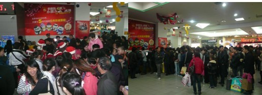 将整个舞台区域的气氛烘托到最高潮的当然是由SM组织的平安夜整点抽奖活动,美的电饭煲、豆浆机、蝶妆礼盒、天王表、诺基亚手机……百份超值多重好礼,让当天在SM消费的顾客朋友们更是满载而已,满意而归。22点、23点、24点、凌晨1点,虽然已经深夜,但围观顾客仍然充满期待,希望好运能够在这个圣诞前夜伴随着自己。