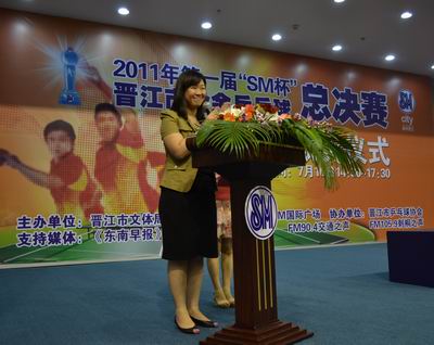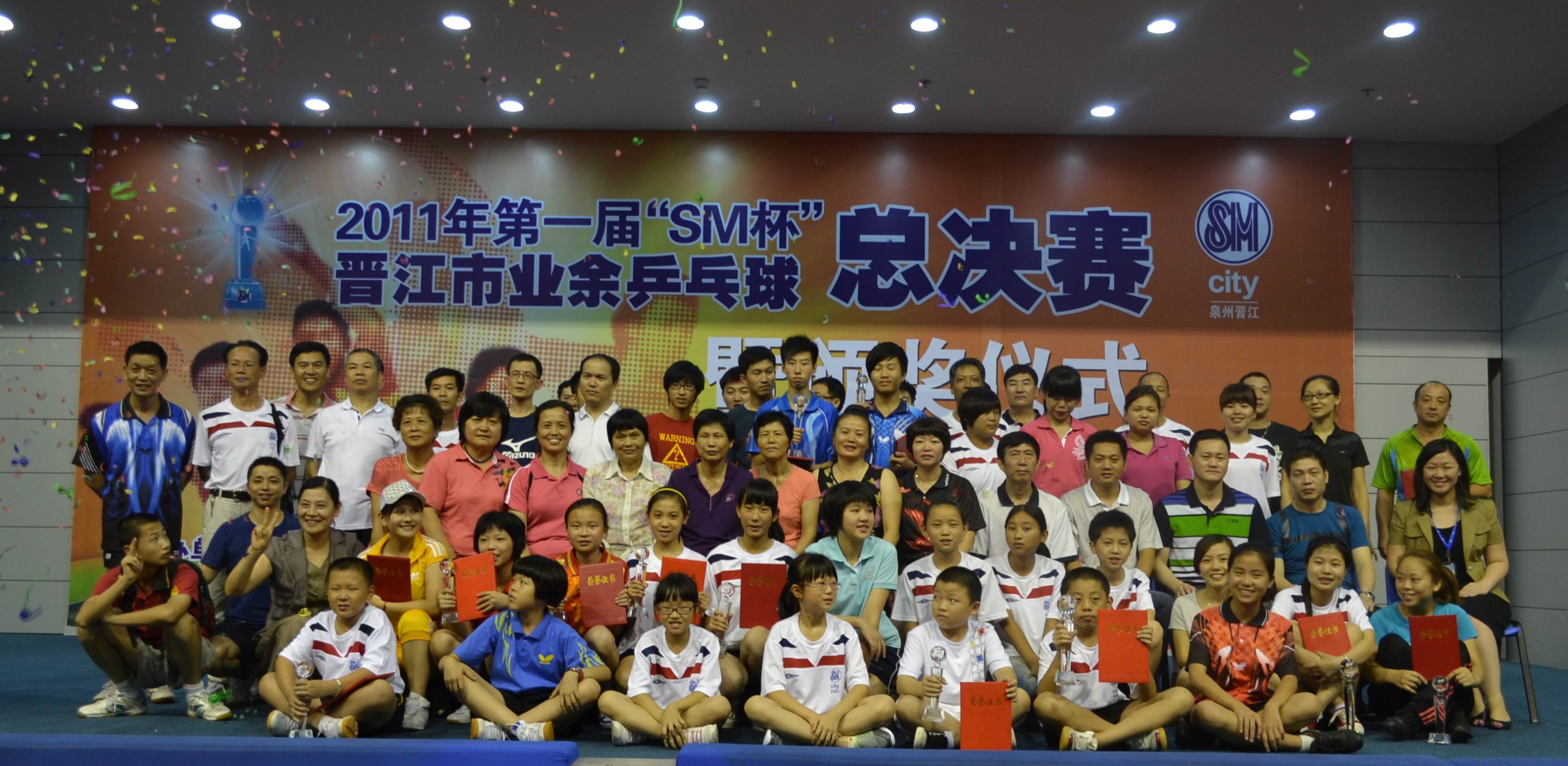 备受瞩目的2011年首届“SM杯”晋江市业余乒乓球大奖赛于7月10日圆满落下帷幕。经过历时两个多月的筹备和三个星期的苦战,各组别冠军璀璨诞生,他们分别是小学女子组冠军林听愉、小学男子组冠军洪能渊、中学女子组冠军沈梦珏、中学男子组冠军孔子健、成人女子组冠军张菁菁、成人男子甲组(18至35岁)冠军张建宏、成人男子乙组(36至49岁)冠军林哲贤、老年男子组冠军余建徽和老年女子组冠军蔡淑美。