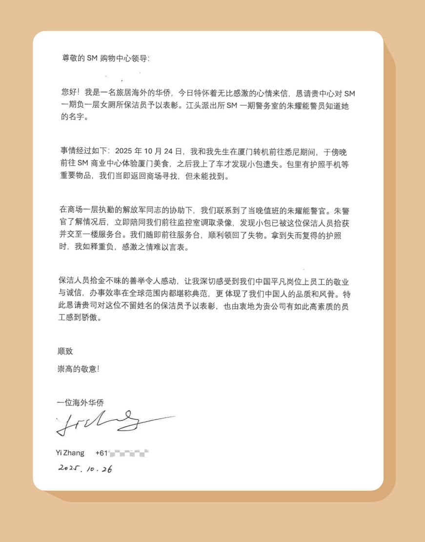 2025年11月21日,SM厦门收到一封来自旅居海外华侨的感谢信,信中真挚讲述了商场保洁员吴梅拾金不昧的善举,并恳请对相关员工进行表彰。