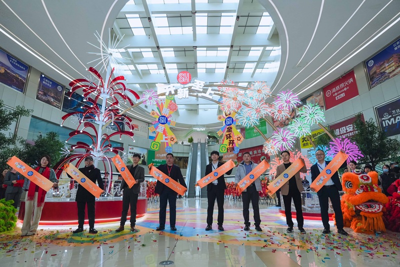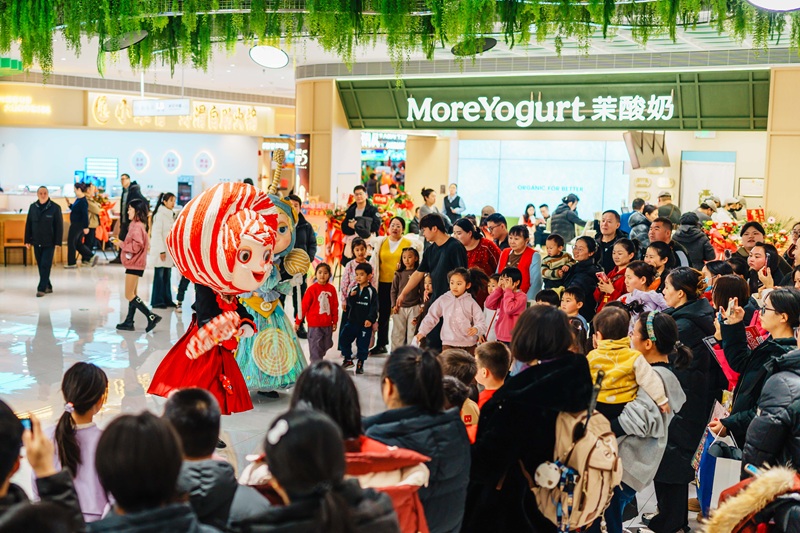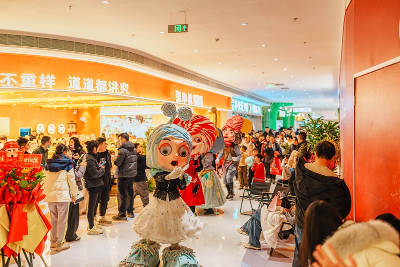 为庆祝这一重要时刻,SM广场倾力打造了“惠”聚人气的开业盛典。早在开业前夕,商场便通过线上渠道释放重磅补贴,推出“25元团50元”、“70元团100元”等多档代金券,实现消费立减。顾客在美食区打卡集章,可兑换独家限定周边;累计消费满额更可参与抽奖,赢取缤纷好礼。除了实实在在的让利,一场充满奇思妙想的艺术之旅也随之开启。1月17日至18日,曾受邀参与乌镇戏剧节古镇嘉年华的哈珀剧团,携原创IP剧目《糖果家族》登陆SM广场,为顾客带来了沉浸式互动表演,为商场增添了更多艺术活力。与之相映成趣的,是商场精心布置的美学场景:中庭上空,如幻梦倾泻般的吊挂装置,折射出璀璨的光之瀑布;三层空间内,翡翠流瀑般的天花艺术蜿蜒铺展,让人仿佛漫步于流动的色彩星河。这些投入,无不彰显SM广场致力于营造全方位焕新体验的用心。