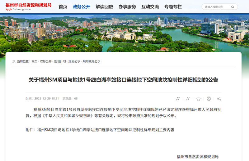 近日,福州市自然资源和规划局公告显示:SM福州仓山城市广场(简称“SM福州”)与地铁1号线白湖亭站接口连接地下空间地块控制性详细规划,已经法定程序获得福州市人民政府批复。